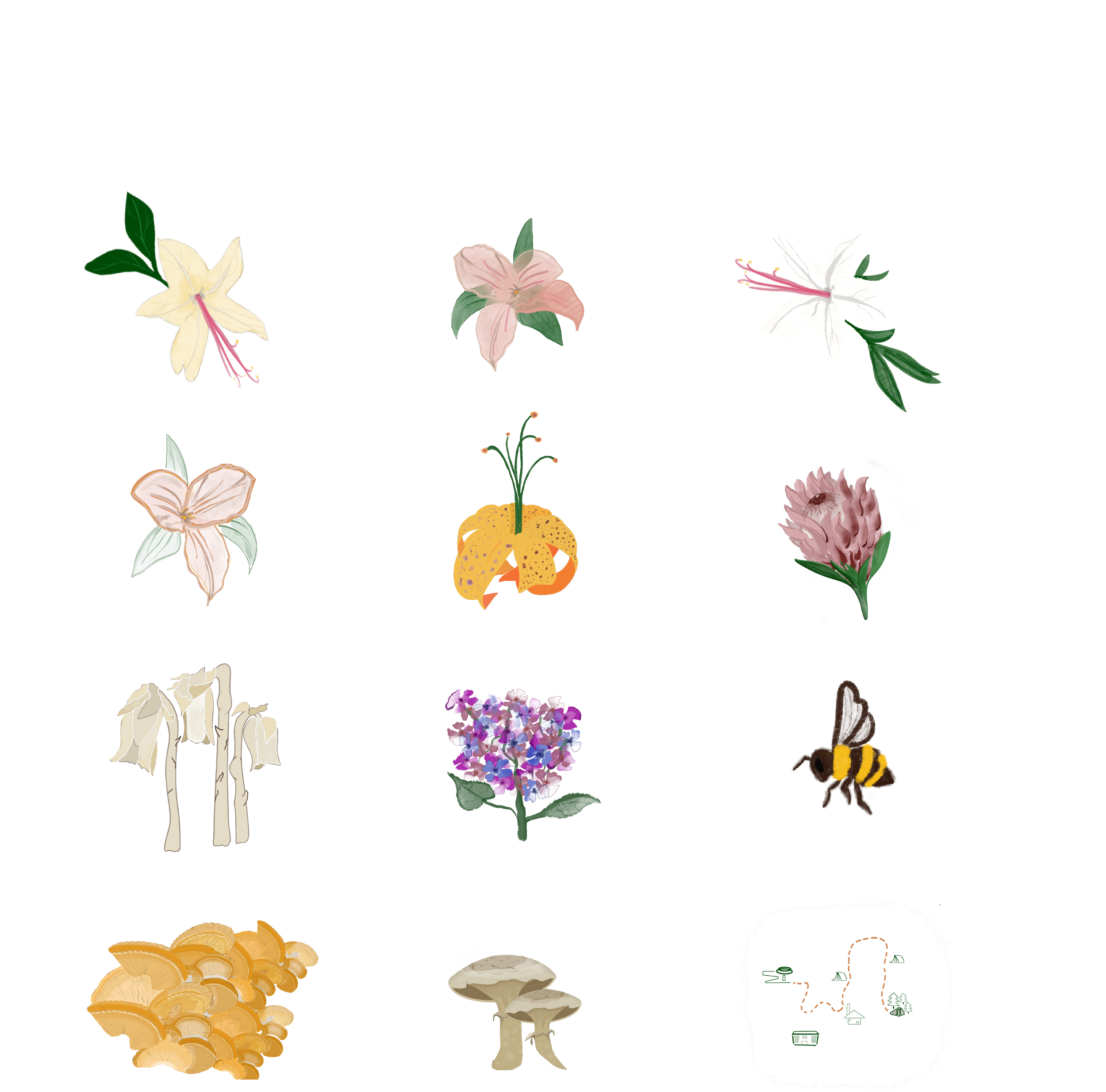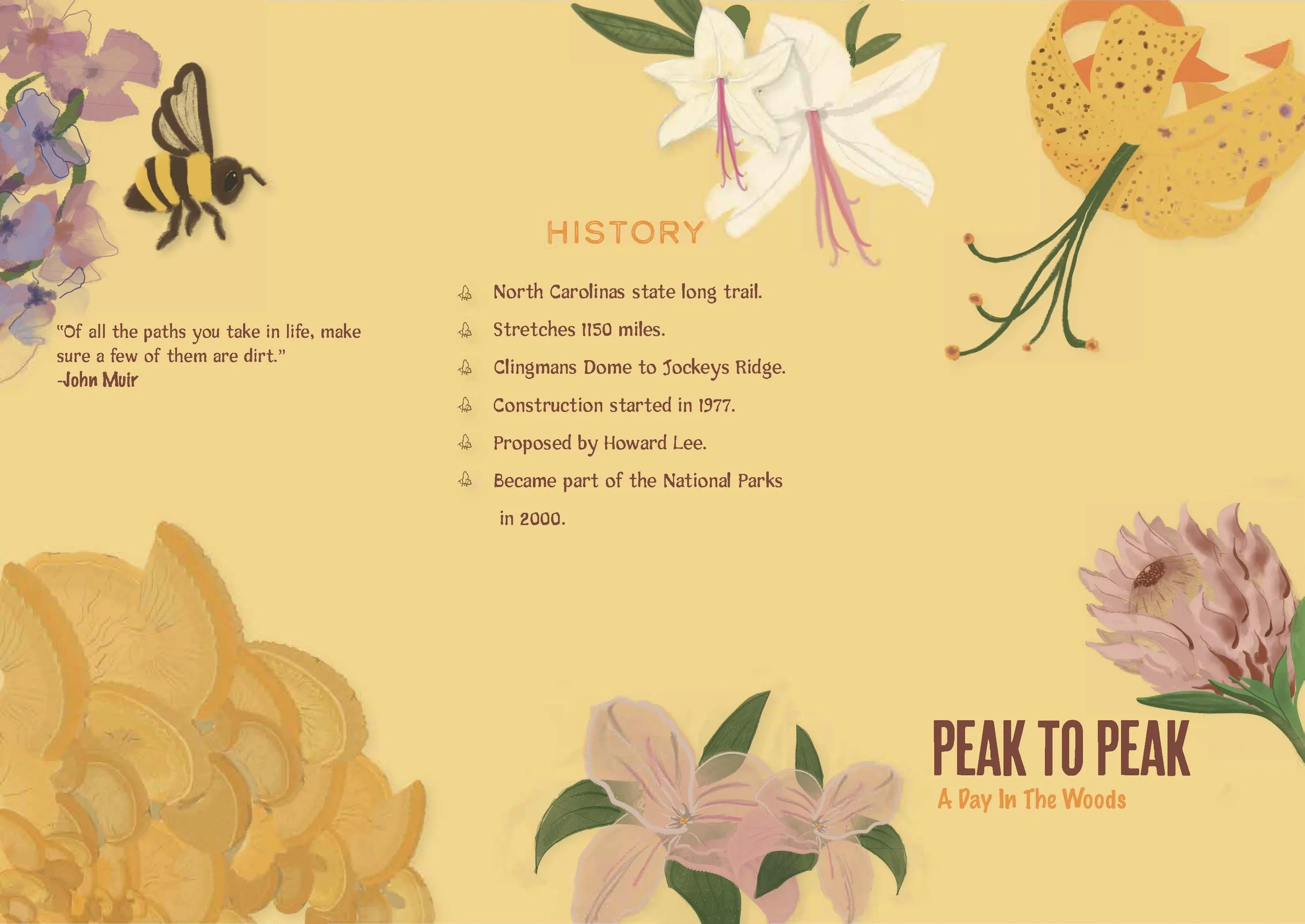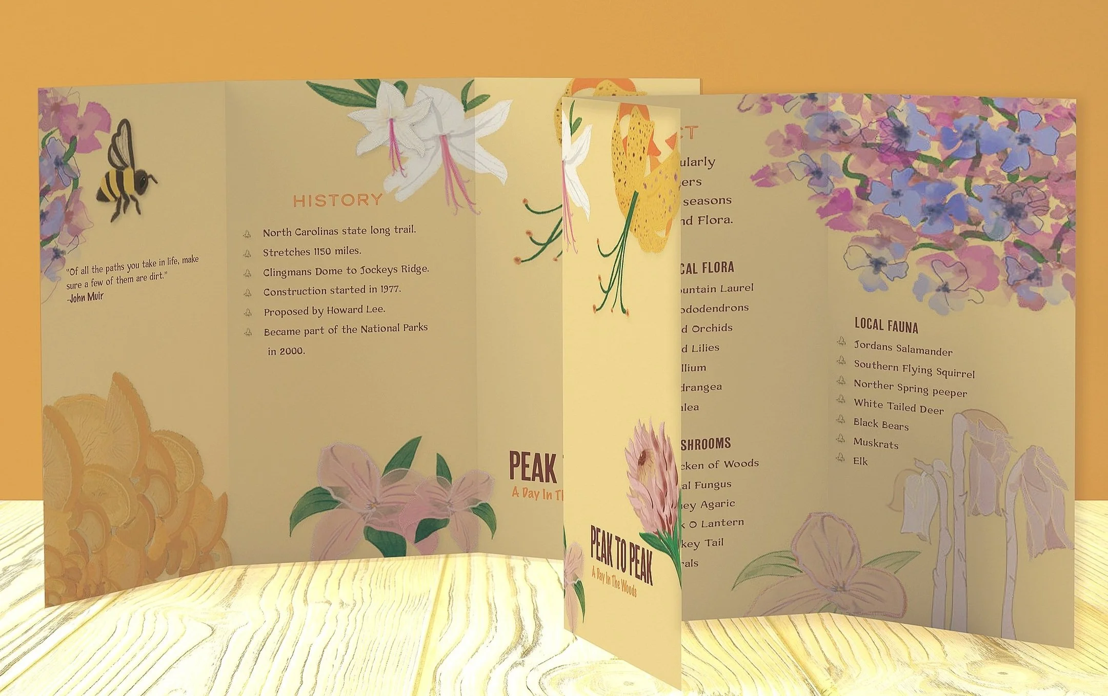 The Mountains-To-Sea Trail project was initially inspired by the beautiful flora and fauna that i encountered on my own weekend backpacking trips on the M-S-T, while living in North Carolina. The M-S-T is considered North Carolina’s long trail, and even among avid hikers this trail is not well known. It runs from Clingmans Dome in the Great Smokey Mountains to Jockeys Ridge, on the coast. The concept behind this project was to bring more awareness to this beautiful local trail and encourage active participation and interest in the local wildlife by getting people out in the woods. I tackled this concept by making the pamphlet about the beauty one sees on the trail, in contrast to a typical trail guide that focuses on mapping out hotspots on the trail through photography. I brought the focus onto the beauty of what one can see on this trail through illustrated drawings. These illustrations eventually transformed into a whole branding concept with its own logo and stickers.